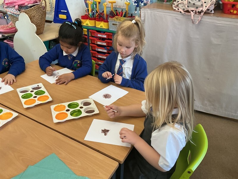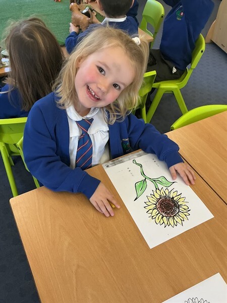 This week we have been learning about harvest. We have learned some harvest songs such as ‘Big Red Combine Harvester’ and have looked at how farmers gather crops in the Autumn to make sure we have plenty of food in the winter months. We have looked at some of the plants that we can grow and harvest for food in this country, including corn, wheat and sunflowers. We were lucky enough to have a huge sunflower head to explore and harvest the seeds from using tweezers and our fingers! We will keep the seeds safe over winter and plant them in Spring. We have also enjoyed painting beautiful sunflowers which can be seen displayed in our classroom.