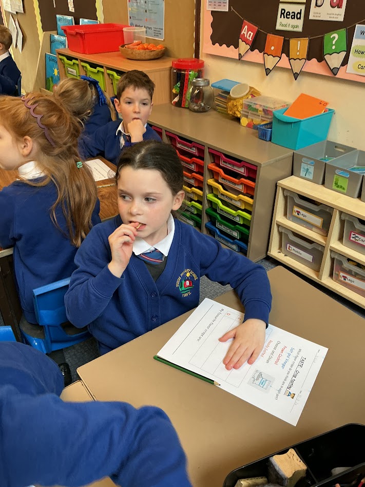 We learnt about our 5 senses: smell, taste, touch, sight and hear. We completed some investigations to see if we could use our senses, such as a taste test for different flavoured crisps, a touch test for items hidden in a bag, a hearing test where we tried to listen to things close and far away, and a smell test where we tried to guess different items just by smelling them!