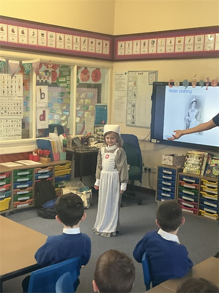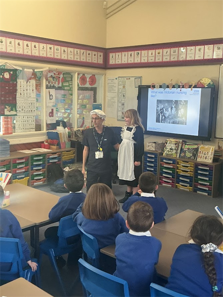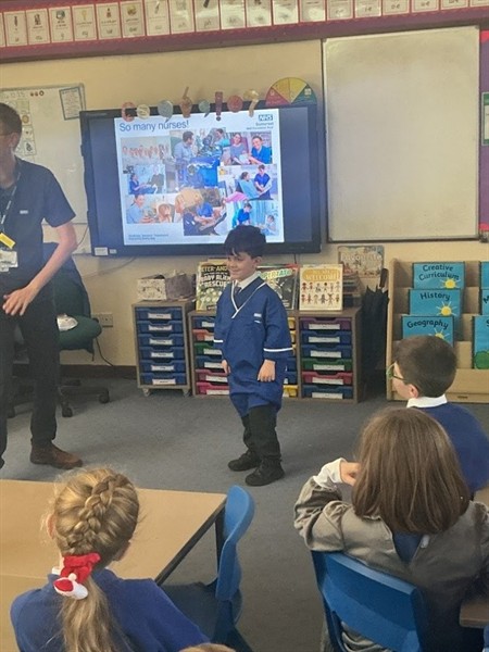 This afternoon we were lucky enough to have a visit from Mark who works at the NHS. He came to speak to us about the vital work that the NHS do to help people. We discussed some of the important jobs that people in the NHS do before thinking about what it is like to work in a hospital. We shared with him our knowledge of Florence Nightingale and he told us about how hospitals have changed since the Victorian era. These changes included cleanliness, uniforms and knowledge of medicines. Some of us even got to try on the uniforms!
