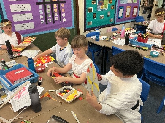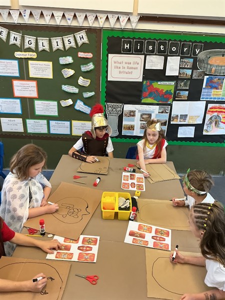 In the morning, we recapped some of our previous learning about Roman Numerals. We then designed our own Roman mosaic shields based on traditional designs, considering the meaning of each of the elements of the crest. We later created them ready for our battle in the afternoon.