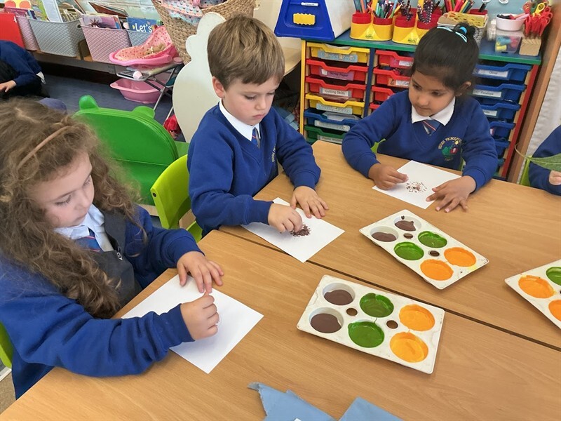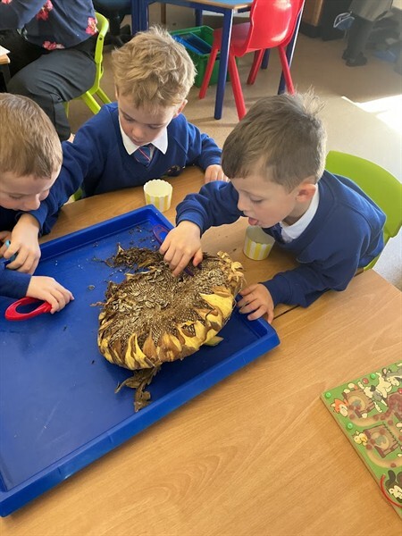 This week we have been learning about harvest. We have learned some harvest songs such as ‘Big Red Combine Harvester’ and have looked at how farmers gather crops in the Autumn to make sure we have plenty of food in the winter months. We have looked at some of the plants that we can grow and harvest for food in this country, including corn, wheat and sunflowers. We were lucky enough to have a huge sunflower head to explore and harvest the seeds from using tweezers and our fingers! We will keep the seeds safe over winter and plant them in Spring. We have also enjoyed painting beautiful sunflowers which can be seen displayed in our classroom.