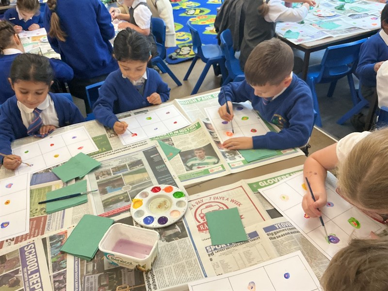 We learnt about the shapes and colours that Kandinsky uses. There were lots of triangles and circles and we even learnt about trapeziums! We coloured in his artwork, thinking about the colours and shapes. We made a replica of Kandinsky’s most famous piece ‘Circles’. We had to use a range of contrasting colours to create lots and lots of circles. We then painted the square to create a background colour.