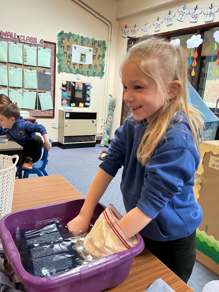 Later on in the week, we had a discussion about baby animals and what we call them. We were lucky to have a visitor from Longleat who taught us all about the 5 animal groups. We conducted an investigation to see whether blubber works to keep penguins and other polar animals warm. We used a vegan fat blubber glove and tested it in the some icy, cold water. It kept one hand warm but the unprotected hand got cold very quickly! After the experiment, we discussed our results.