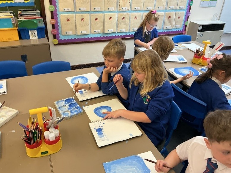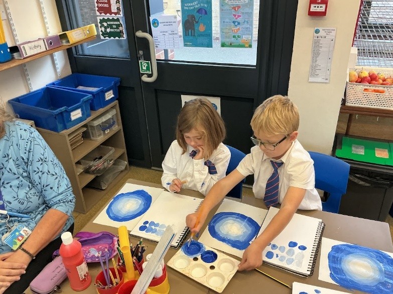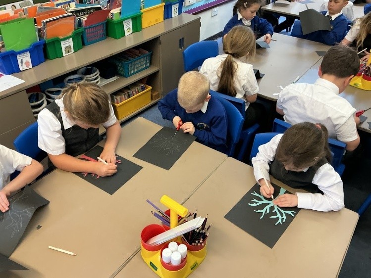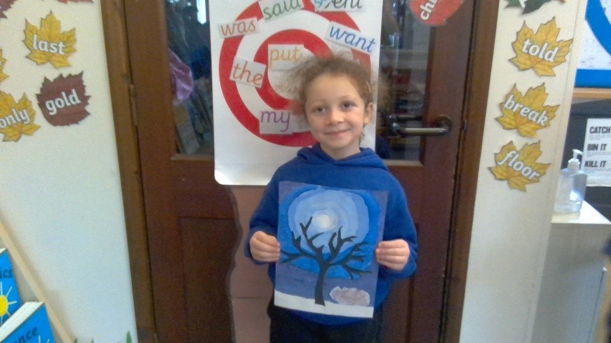 This week we created a beautiful Winter Scene. We started by exploring colour and how to make as many tones of one colour as possible using white. We then painted a winter sunset starting with white, progressing to dark purple. To improve our sketching and cutting skills we drew a winter tree using a template and very carefully cut it out. Next, we stuck the tree on to our winter sunset to create a silhouette and discussed the effect of light and dark. Finally, we sketched a fox, cut it out and stuck it on the foreground of our winter scene.