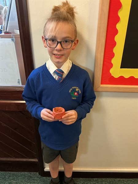 We spent a lesson experimenting with clay. This involved using different methods to shape it into a pot, as well as to create patterns and designs in the clay.