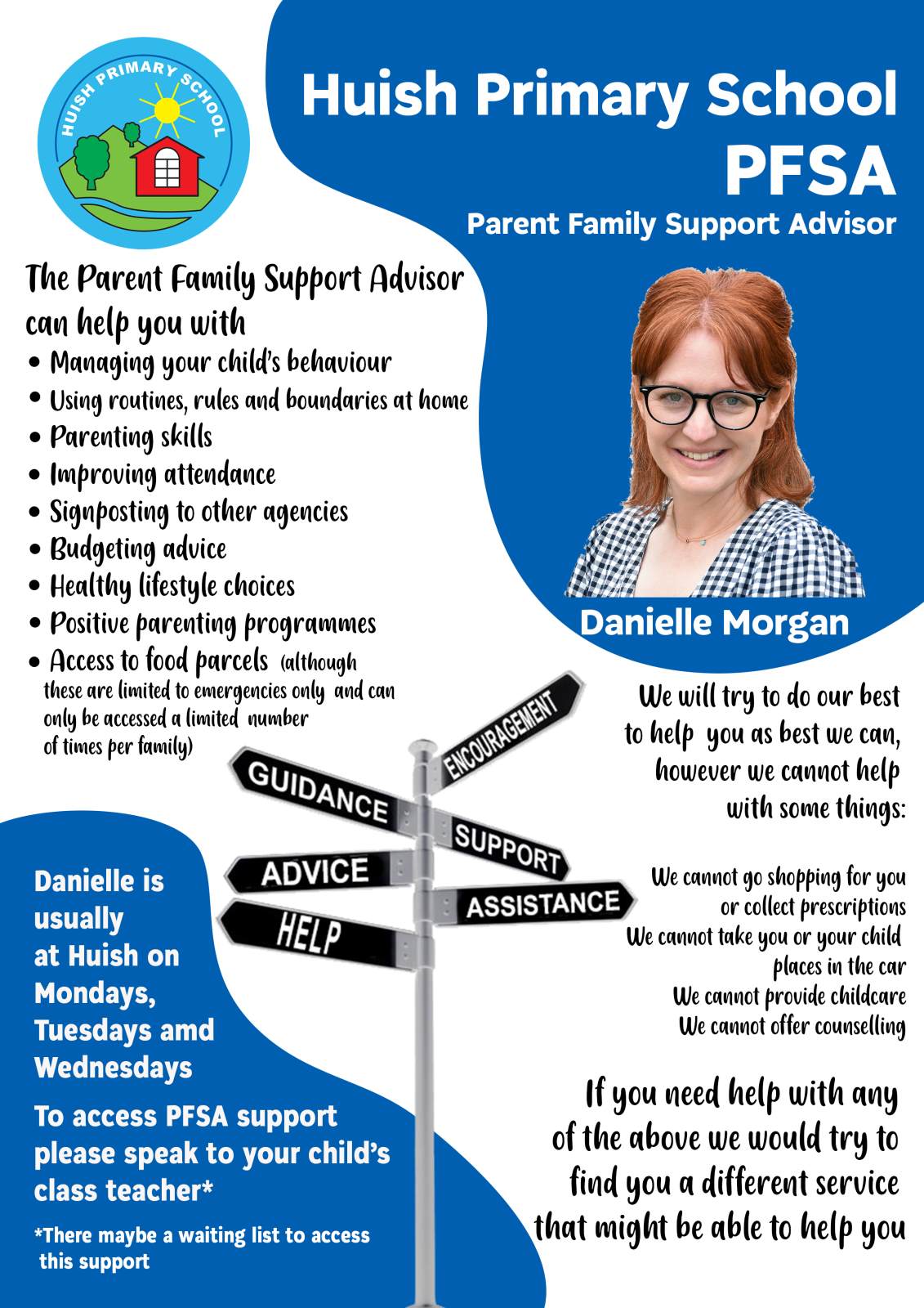 Our PFSA is Danielle Morgan. She works on a Monday, Tuesday and Wednesday at Huish Primary School.